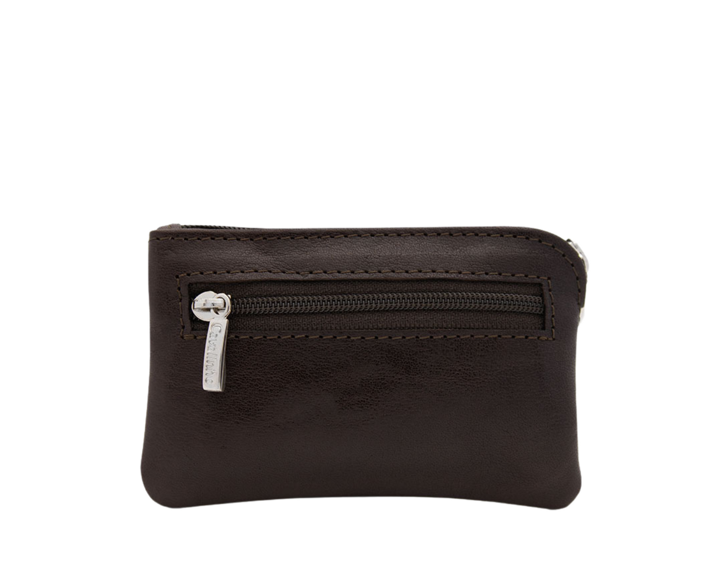 Practical coin purse with top zip. It has a keyring inside and a back zipper pocket.